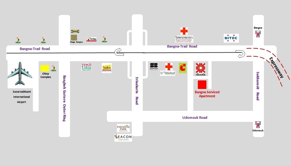Bangna Serviced Apartment is the luxurious residence with hotel standard quality situated at Soi Bangna-Trad 23, behind Central Bangna Department store and Big C Bangna. From Suvarnabhumi International Airport of Thailand, you can reach to our residence for only 15 minutes by car and 2 minutes to nearest hospital. Our location is convenient for transportation to Chonburi and Down town.