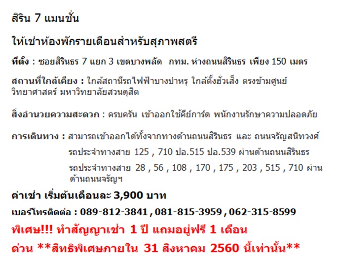 ให้เช่าห้องพักรายเดือนสำหรับสุภาพสตรี