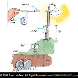 2. บริเวณรอยต่อของสายไฟต้องใช้เทปพันสายไฟชนิด "ยางละลาย" เท่านั้น (ม้วนละ 70 บาท) เพราะเป็นเทปที่ป้องกันน้ำและความชื้นได้ (ห้ามใช้เทปสีดำธรรมดา) จากนั้นก็ฝังสายให้อยู่ลึกลงไปอย่างน้อย 1 ฟุต