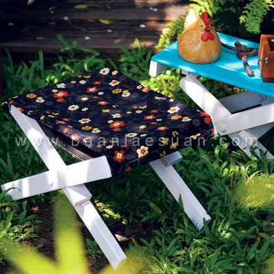 5. นำผืนผ้าที่เตรียมไว้สวมประกอบเข้าไปในโครงไม้ ลองกางเก้าอี้ จัดผ้าให้ตึงเรียบร้อย