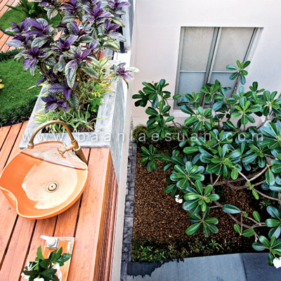 ?ตอนสร้างบ้านก็ตั้งใจไว้อยู่แล้วว่าจะจัดสวนบนหลังคาที่จอดรถ เพราะว่าตรงนี้เป็นระเบียงที่เชื่อมต่อออกมาจากห้องนอนด้วย จึงเริ่มหานักจัดสวนจากใน ?บ้านและสวน? เห็นผลงานของบริษัทกิ่ง ก้าน ใบที่เคยลงในนิตยสารก็ชอบ เลยติดต่อให้เข้ามาช่วยออกแบบ แต่ก็ช่วยกันออกความคิดค่ะบางอย่างดิฉันสเก็ตซ์เอง เช่น วงกลมปลูกต้นไม้บนพื้น วงนี้ใส่กรวด วงนี้ปลูกหนวดปลาดุกแคระ และต้องการสวนแนวตั้ง เพราะว่าบนนี้ไม่มีที่ปลูกต้นไม้? คุณวิรังรองเล่าให้ฟังพร้อมกับเตรียมน้ำพั้นซ์สีสวยที่ผสมเองมาต้อนรับ
