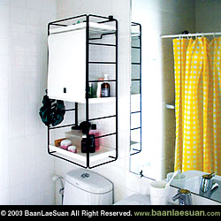 เริ่มต้นกันด้วยทำเลทองของห้องน้ำทุกห้อง คือ บนผนังเหนือโถสุขภัณฑ์ นอกจากจะมีพื้นที่ใหญ่พอสมควรซึ่งไม่ได้ใช้งานแล้ว ยังเป็นพื้นที่แห้ง และปลอดภัยจากน้ำเมื่อถึงคราวต้องทำความสะอาดห้องน้ำ อุปกรณ์จำเป็นสำหรับมุมนี้คือ ตู้หรือชั้นวางของชนิดติดผนัง ไม่ว่าจะเป็นชั้นสำเร็จรูปอย่างในภาพหรือแบบที่สั่งทำ ควรเลือกที่มีความกว้างไม่เกินขนาดของโถสุขภัณฑ์ และไม่ควรยื่นออกมากเกินไป เพื่อให้ดูเรียบร้อยเป็นหนึ่งเดียวกับโถสุขภัณฑ์ ถ้ามีทั้งส่วนที่เป็นตู้ปิดและส่วนที่เป็นชั้นโปร่งก็ยิ่งดี จะได้ใช้ส่วนปิดเก็บของที่ต้องการความสะอาดมากหรือสต็อคของ เช่น เก็บกระดาษชำระหรือสำลี ส่วนชั้นโปร่งหยิบง่ายสำหรับวางของที่ใช้ทุกวัน อย่างเครื่องสำอาง สำหรับใครที่ชอบอ่านหนังสือยามปลดทุกข์ ชั้นที่ว่าก็ใช้วางหนังสือได้ด้วยเพราะอยู่ใกล้จุดใช้งานมากๆ ข้อสำคัญคือต้องเว้นระยะให้สูงพอจะเปิดฝาหม้อน้ำได้