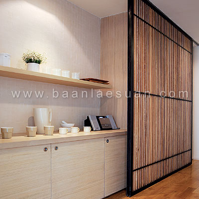 - บริเวณผนังที่ทำเป็นตู้และชั้นวางของแบบเต็มทั้งผนัง ติดตั้งรางพร้อมประตูบานเลื่อนขนาดใหญ่ที่กรุหน้าบานด้วยไม้ระแนงไว้ด้านหน้าแนวผนัง ใช้เป็นส่วนตกแต่งที่สามารถเลื่อนเปิดเพื่อโชว์ชั้นวางของและไปบังส่วนตู้เรียบๆ หรือจะเลื่อนมาปิดชั้นวางของในเวลาที่ดูไม่เรียบร้อยก็ได้ เพิ่มลูกเล่นด้วยการติดตั้งหลอดไฟให้มีแสงลอดออกมาระหว่างระแนงไม้ ก็ยิ่งทำให้มุมนี้ดูน่าสนใจมากขึ้น