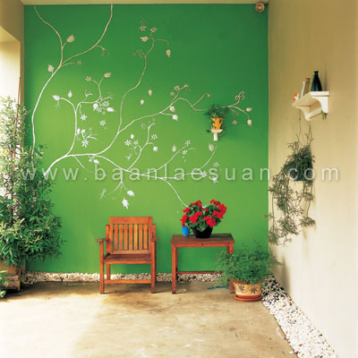 "ช่วงก่อนไปอบรม ต้นไม้ที่บ้านโทรมไปหลายต้นเหมือนกันค่ะ เพราะเป็นช่วงที่ต้องออกทัวร์ต่างประเทศติด ๆกัน ทำให้ไม่มีเวลาดูแลต้นไม้ แต่ถึงแม้ว่าทางบ้านและสวนไม่จัดโครงการนี้ขึ้นมาก็ตั้งใจไว้แล้วค่ะว่าจะปรับปรุงสวนที่บ้านใหม่ โดยเฉพาะน้ำตกหน้าบ้านตั้งใจจะทำอยู่แล้ว อีกอย่างคือผนังที่เพ้นต์เพิ่มเติมมีทั้งของเดิมตรงซุ้มที่เราทาสีพื้นทับลงไปใหม่ โดยเลือกใช้สีส้มช่วยให้มุมนี้ดูสดใสขึ้น กับผนังตรงที่จอดรถวาดเป็นลวดลายดอกไม้คล้ายกับตรงซุ้มให้ดูต่อเนื่องกัน ซึ่งตรงนี้คิดอยู่นานมากว่าจะใช้สีอะไรดีจนมาลงตัวที่สีเขียว"
