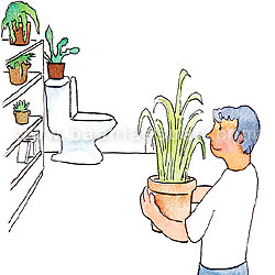 ไม้ที่ปลูกได้ในที่ชื้นๆ แสงน้อยถึงปานกลางก็มีเยอะ เช่น พลูด่าง ปาล์มไผ่ ลิปสติก หรือริปซาลิส ถ้าอยากได้ชนิดที่มีสีสันหน่อยก็ลองพลูทอง อโกลนีมา หมากผู้หมากเมีย คล้าตระกูลต่างๆ เช่น ขุนแผน และม้าลาย อีกชนิดที่มีลายสวยก็คือ สาวน้อยปะแป้ง แต่ต้องระวังยางของมัน โดยเฉพาะห้องน้ำของเด็กเล็กๆ