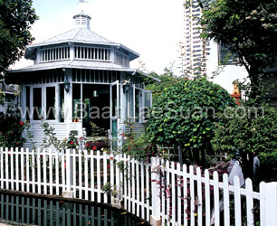 หากเปรียบสวนเสมือนห้องห้องหนึ่งภายใต้ชายคาของร่มไม้ คงเป็นห้องที่น่าพักผ่อนสำหรับผู้มีใจรักธรรมชาติอย่าง คุณมานิตย์ และคุณอุษา รอดบุญ ด้วยเหตุนี้ คุณอาบพร รอดบุญ บุตรสาว จึงสร้างห้องกลางสวนห้องนี้ขึ้นมา โดยประยุกต์จากศาลาเพื่อให้คุณพ่อและคุณแม่ได้ใช้เวลาในช่วงวันอยู่ท่ามกลางสีเขียวอันสดชื่นของพรรณไม้ในสวน ซึ่งทั้งคู่บรรจงจัดและตกแต่งเอง