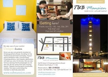 แนะนำหอพัก ที ยู บี แมนชั่น ที่พักใกล้ Don muang airport โรงเรียนชลประทานวิทยา โรงเรียนสวนกุหลาบนนทบุรี หากท่านกำลังมองหาที่พักใกล้อิมแพคเดินทางสะดวก รถไม่ติด ไม่ต้องขับเข้าซอย ขอแนะนำ ที ยู บี แมนชั่น ห้องพักที่ตอบโจทย์ได้เป็นอย่างดี ซึ่งมีทั้งหอพักรายวัน รายเดือน ฟรี ที่จอดรถและ WiFi ห้องกว้างขวางบรรยากาศดี เหมาะแก่การพักผ่อน เปิดบริการตลอด 24 ชั่วโมง ห้องแอร์ เฟอร์นิเจอร์ครบครัน ทั้ง ตู้เย็น ทีวี โต๊ะเครื่องแป้ง ตู้เสื้อผ้า พร้อมระเบียงเพื่อรับอากาศหลังห้องหรือต้องการสูบบุหรี รายวันเพียง 700 บาท รายเดือน 4000 บาท เป็นหอพักแถวแจ้งวัฒนะที่ราคาย่อมเยาว์ เจ้าของใจดี สามารถพูดภาษาอังกฤษและภาษาจีนได้ สนใจติดต่อขอข้อมูลเพิ่มเติมที่ 081-3140525 / 029-626700