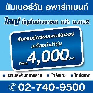 นัมเบอร์วันอพาร์ทเม้นท์ ให้ความสุขทุกความต้องการของการอยู่อาศัยพร้อมคุณภาพชีวิตที่ดีกว่าด้วยห้องแอร์พร้อมเฟอร์นิเจอร์ การันตีคุณภาพด้วยรางวัล “หอพักติดดาว” อันดับ 1 และรางวัลหอพักปลอดยาเสพติด จากมหาวิทยาลัยรามคำแหง ดูรายละเอียดเพิ่มเติมได้ที่ www.numberoneapartment.com ติดตามโปรโมชั่นได้เร็วก่อนใคร www.facebook.com/numberoneapartmentram2 หรือโทร. 02-740-9500 ต่อ 117-118 หรือ 081-924-0294